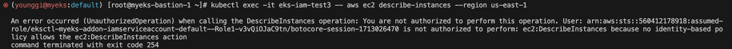 kubectl exec -it eks-iam-test3 -- aws ec2 describe-vpcs --region ap-northeast-2