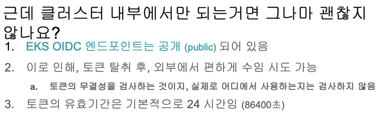 - AWS는 JWT 토큰의 유효성만 확인 하지만 토큰 파일과 서비스 계정에 지정된 실제 역할 간의 일관성을 보장하지는 않음 → Condition 잘못 설정 시, 토큰과 역할 ARN만 있다면 동일 토큰으로 다른 역할을 맡을 수 있음